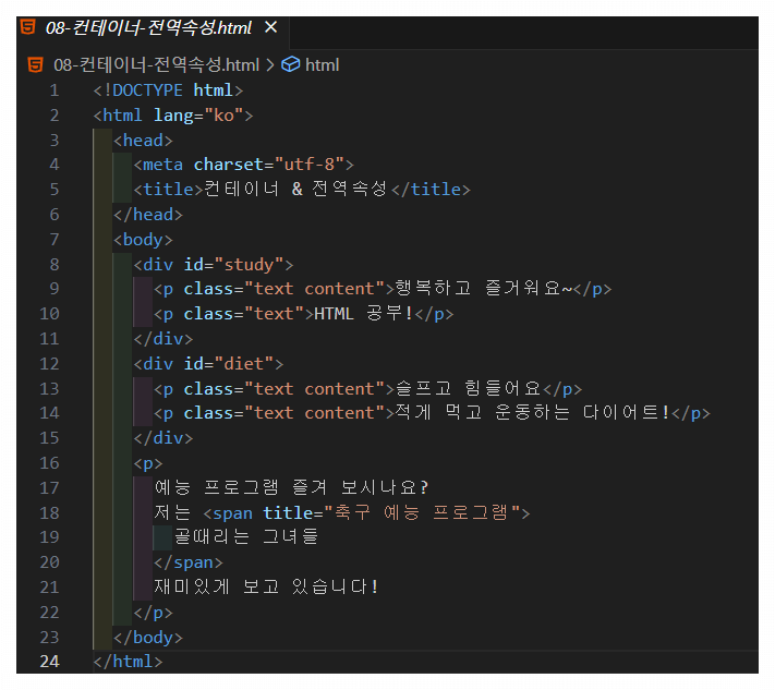 HTML 대부분의 태그에 공통적으로 사용 가능한 속성을 전역 속성이라 합니다.