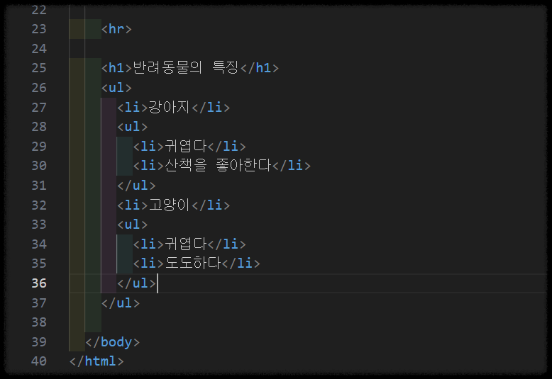각 동물의 특성을 하위 <ul>로 묶었습니다.