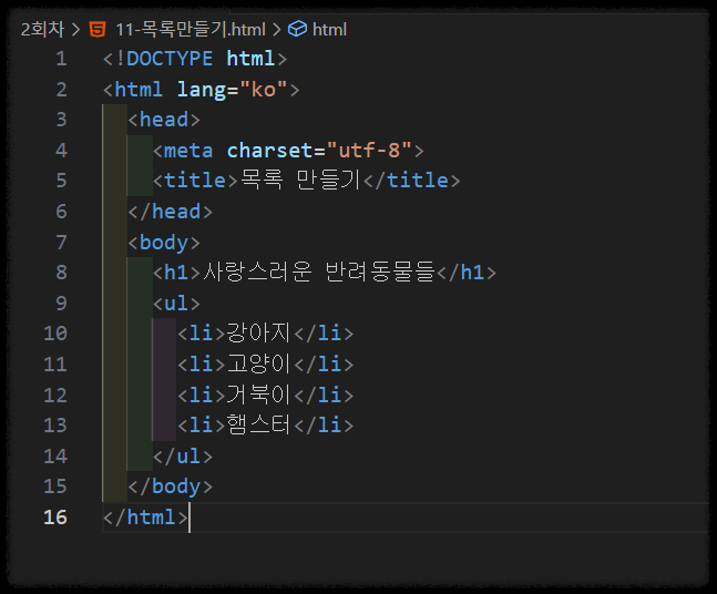 이번 실습은 HTML에서 비순서 목록, 순서 목록, 중첩 목록을 모두 구현하며