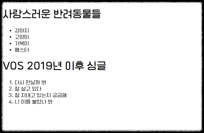 두 개의 섹션으로 나눠서 각각 <ul>, <ol>을 사용한 예제입니다.