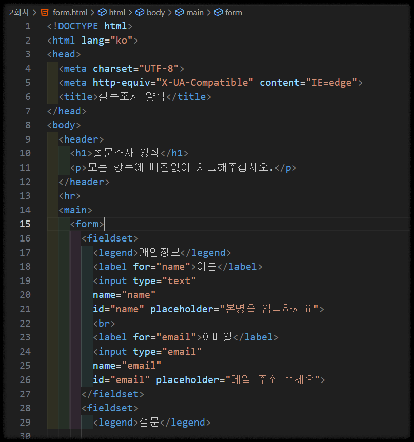 각 입력 영역은 <fieldset>으로 그룹화하고,